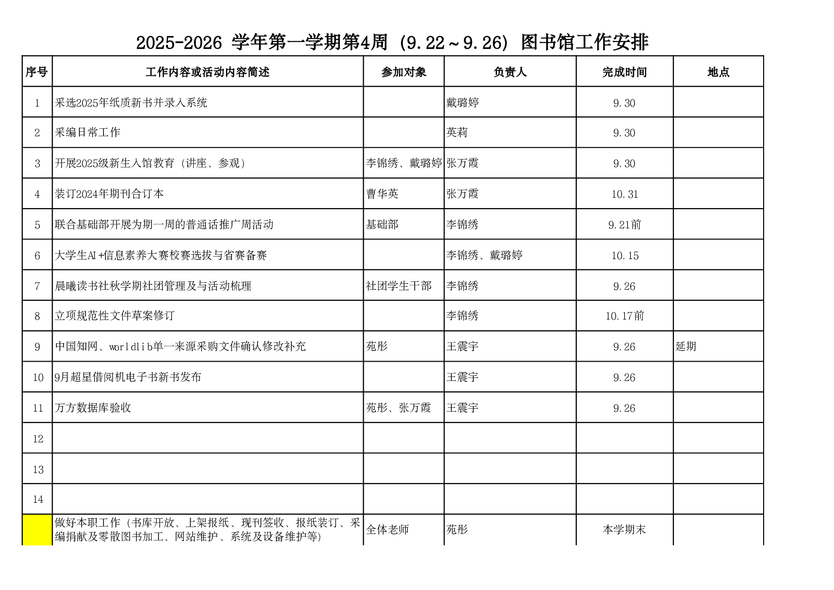 2025-2026学年第一学期第4周(9.22-9.26)图书馆工作安排