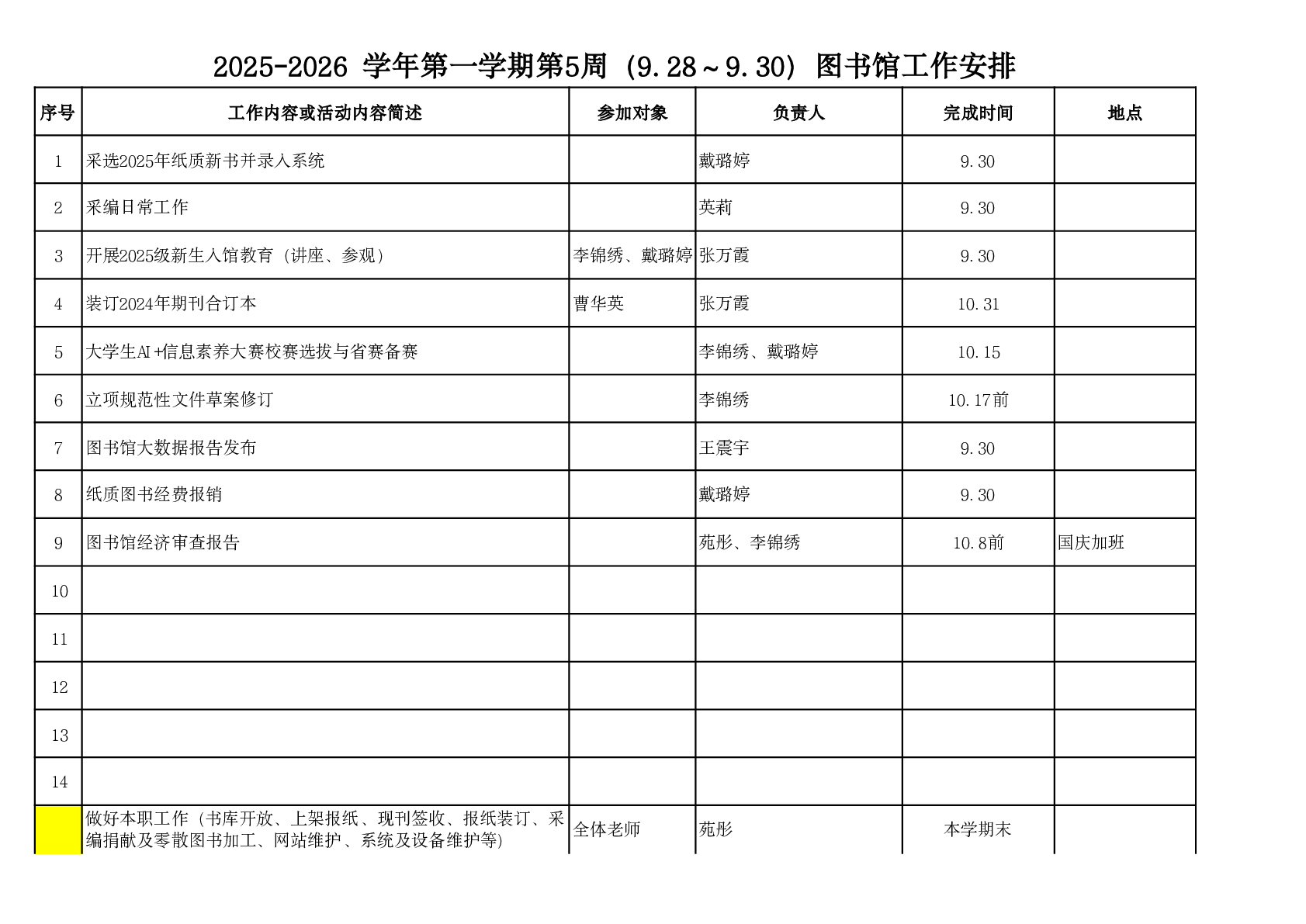 2025-2026学年第一学期第5周(9.28-9.30)图书馆工作安排