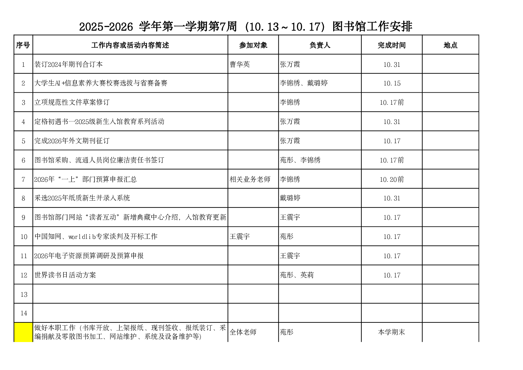 2025-2026学年第一学期第7周(10.13-10.17)图书馆工作安排