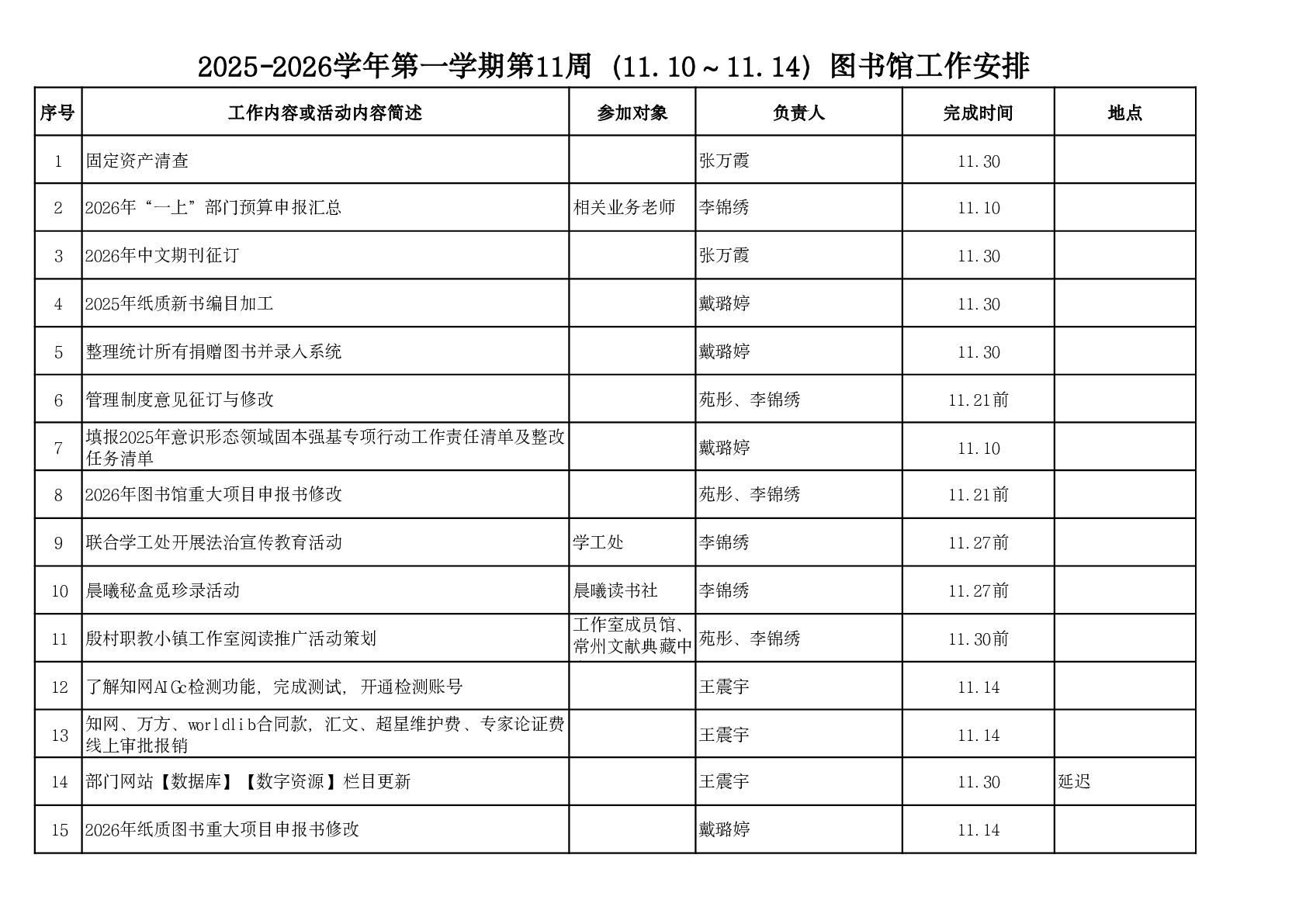 2025-2026学年第一学期第11周(11.11-11.14)图书馆工作安排