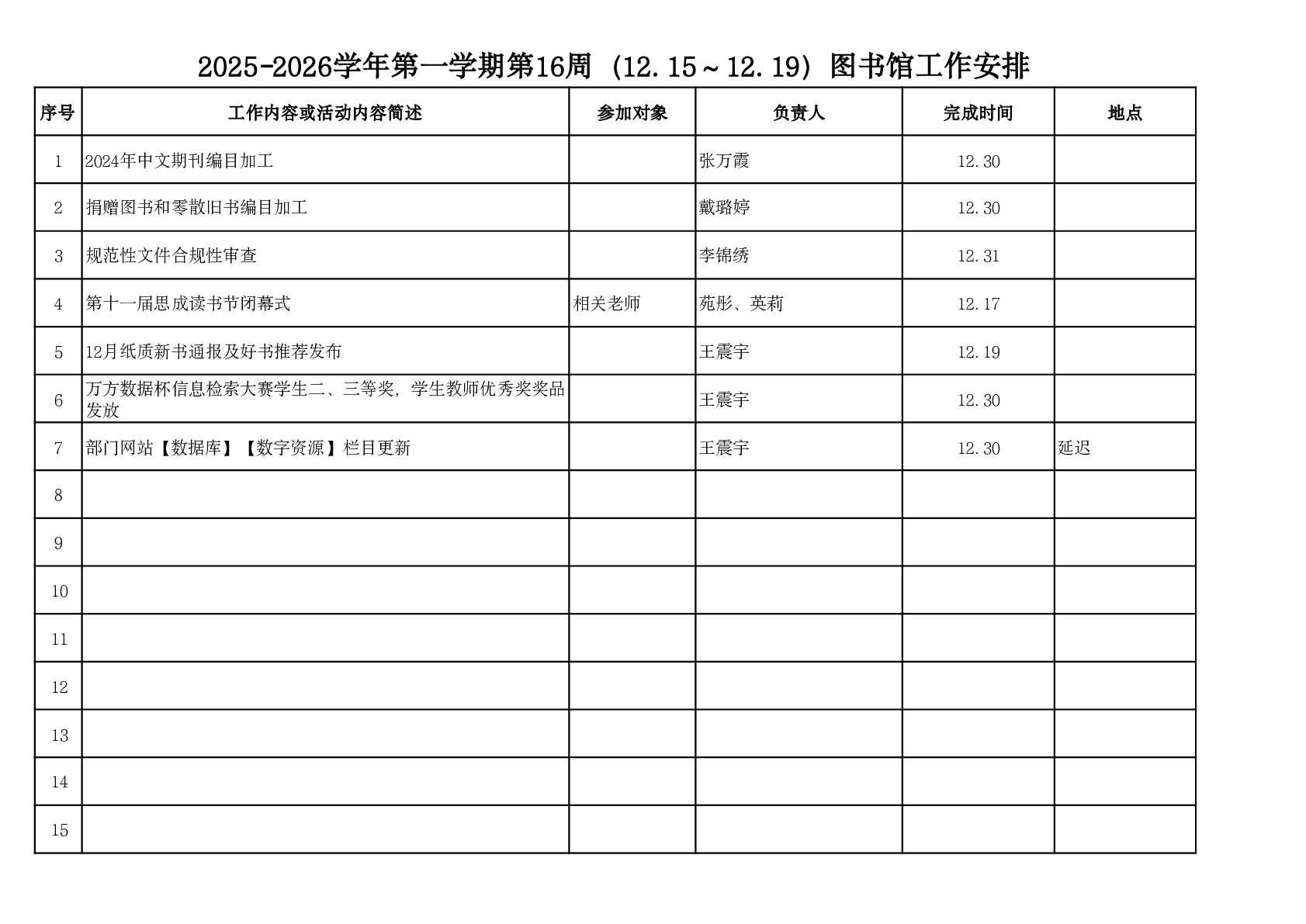 2025-2026学年第一学期第16周(12.15-12.19)图书馆工作安排