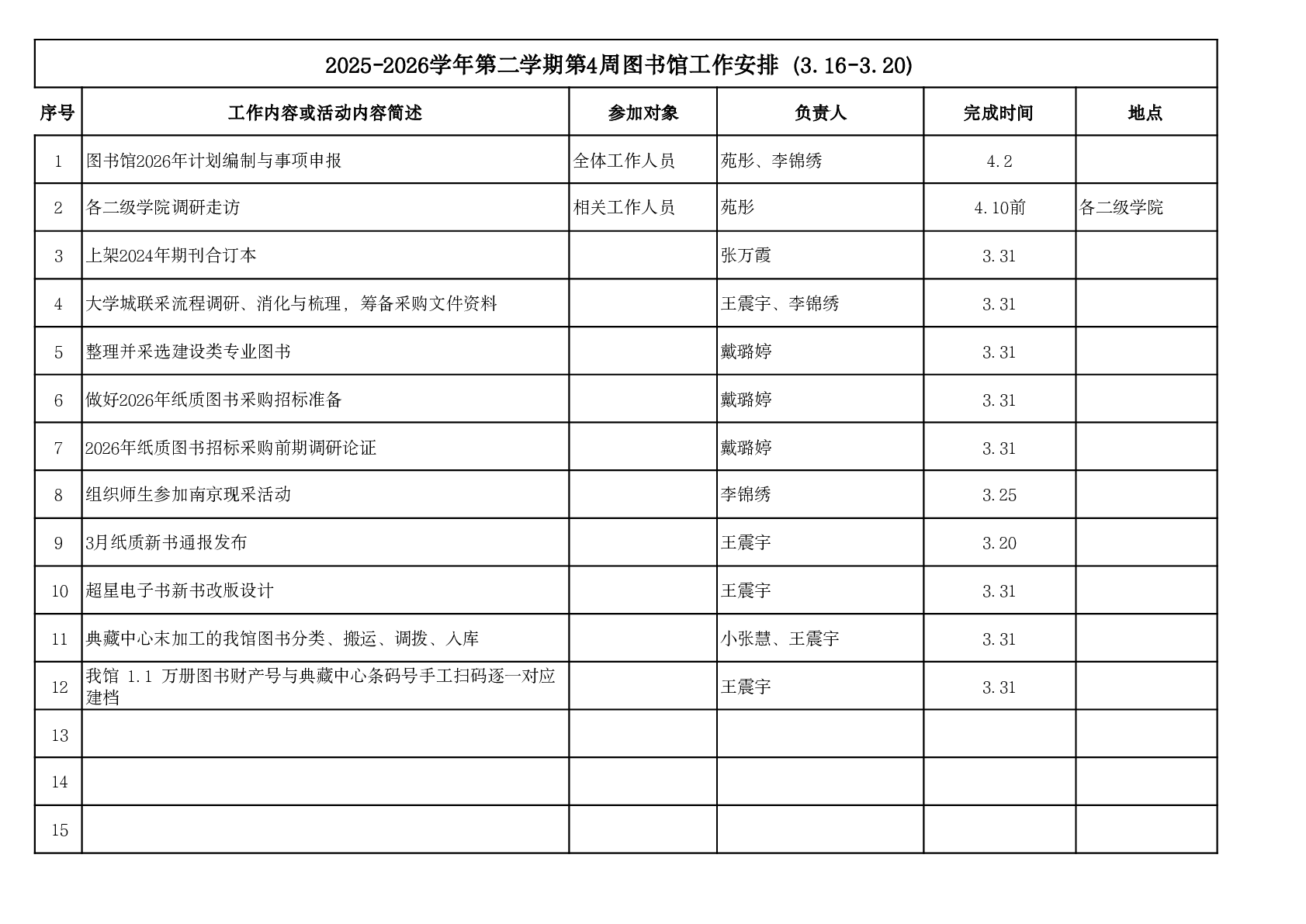 2025-2026学年第二学期第4周图书馆工作安排(3.16-.3.20)